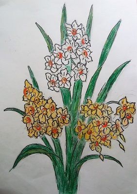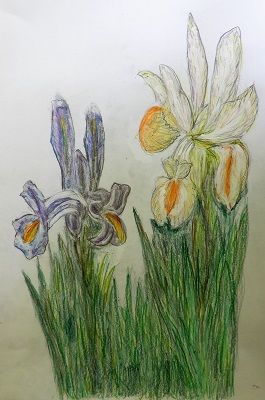 上のアイリスと下の水仙及び喇叭水仙は、智麻呂氏のお友達である友〇さんが「絵の題材に」と下さった花であります。