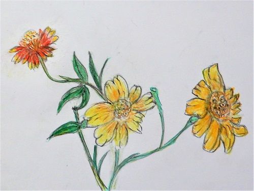 この花は野生化していて、道端などでも、最近はよく見かける花であるが、絵ではちょっと印象の違う花姿になっている。従って、ルドベキアではない可能性も否定できないが、絵画展は花図鑑ではないので、単に「花」であってもいい訳でアルベキア。