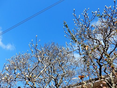 さて、突き当りのもう一つ南側の坂道を少し上ったところにある民家の庭先のハクモクレンが、早くも蕾を膨らませているようなのが目に止まりました。寺の工事は「未だ工事中」という印象でしたが、こちらのハクモクレンは「未