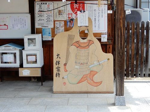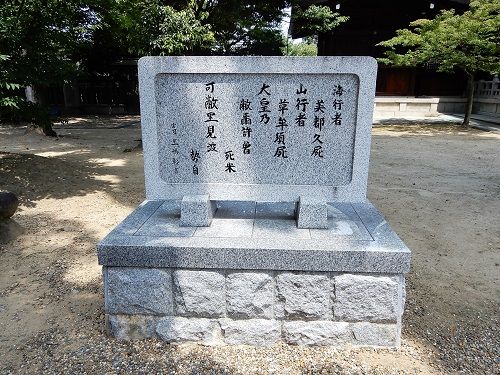 道臣命については、日本書紀に以下の記述がある。 「是の時に、 大伴氏 の 遠祖 日臣命 、 大来目 を 帥 ゐて、 元戎 に 督将 として、山を 蹈 み 啓 け行きて、 乃 ち 烏 の 向 ひの 尋 に、 仰 ぎ 視 て追ふ 。 遂 に 菟田下県 に 達 る。 因 りて其の至りましし処を 号 けて、菟田の 穿邑 と 曰 ふ。時に、 勅 して日臣命を 誉 めて 曰 はく、『 汝 忠 あり 且 勇 あり 。 加 能 く 導 の 功 有り。 是 を以て汝が名を改めて 道臣 とす』とのたまふ。」 (日本書紀 巻三 神武紀 戊午の年六月の条)