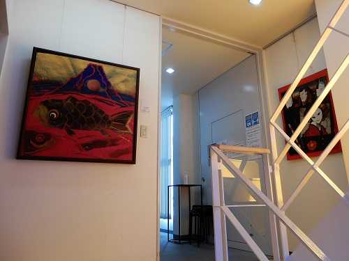 1階右側が喫茶店で、店内にも作品の一部が展示されている。