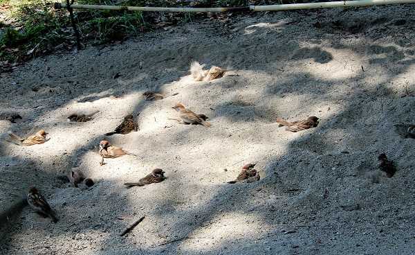 すると目の前に雀たちの砂風呂がありました。以前、花園中央公園で目撃したものと同じような光景です。