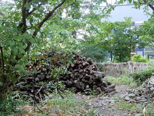 石を積み上げたり、丸太を積んだりしているのも「里山」らしい風景を醸すための仕掛けであるのだろうが、これらによってできる隙間がトカゲなどの小動物の巣や虫の棲家になるという狙いもあってのもの。