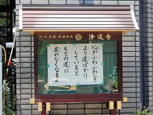 大阪城公園を出て、天満橋で大川を渡り、滝川公園西隣の寺の前を通ると、こんな門前の言葉が掲示されていました。