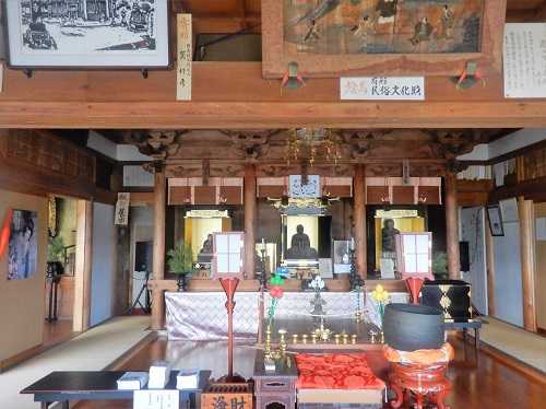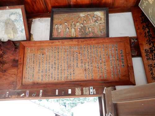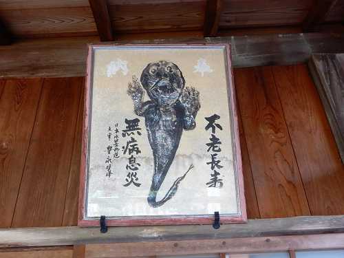 お堂の外壁に掲示されている額にも人魚のミイラが描かれているが、かなりグロテスクな得体の知れない代物である。