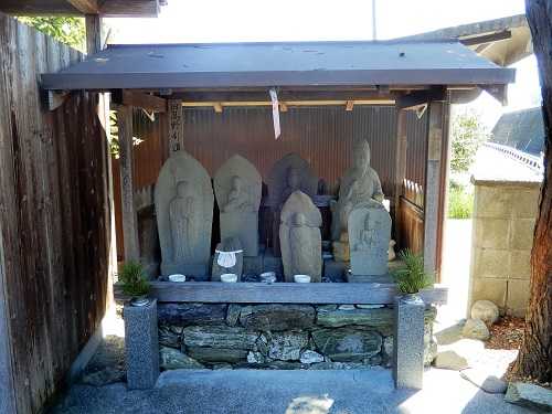 六地蔵としたいところだが、そうでもないようなので「石仏群」としました。道路拡張工事などで移転・撤去を余儀なくされた各所の石仏を集めて収納したという感じである。右側の柱に取り付けられている板切れには「国城の里 観音霊場巡拝六番札所」とあるが、意味がよく分からない。