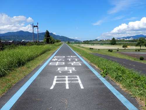 下りに入ったところで、右側(川岸側)にあった歩道が行き止まり。その先は左側が歩道となる。道幅の関係で、歩道は左右どちらか一方にのみ設けられているようです。