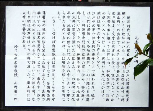 「元の木阿弥」をもじってのふざけた名前であるが、勿論、この狂歌師のことは存じ上げず、この碑によってその名を初めて知ったものであるが、先の「東京ついで銀輪散歩」で「恐れ入谷の鬼子母神」という地口(洒落)が太田蜀山人の作だということを知ったばかりであったから、同時代に活躍した狂歌師という繋がりで、この杢網さんに遭遇したのも「ご縁」というものであったのでしょう(笑)。
