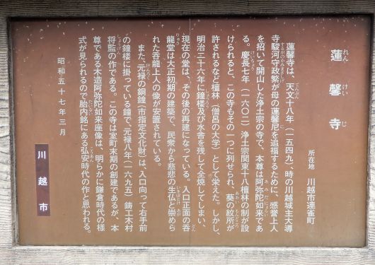 上掲の説明碑に記載の通り、蓮馨寺は、天文18年(1549年)に川越城主大導寺政繁が母の蓮馨尼を追福するため、感誉上人を招いて開山した浄土宗の寺である。