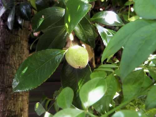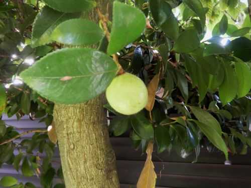 玄関先に出てみたところ、青空が広がる好天気。垣根付近のツバキの木にもう実がなっています。