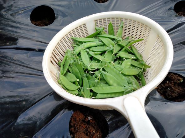 昨年の秋に種を蒔き、不織布などを掛けて冬を越し、今、絹莢が最盛期を迎えました。