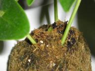 我が家の苔玉3兄弟、このように名前を決めた以降、元気に育っています。 苔以上に、包まれている植物に、新しい葉が出たり、根っこが伸びてきたり。まずは”苔まんぢゅう”ことシェフレラ。10月15日の時点で中心に目が出始めて、本日、よくよく眺めたら、その芽の成長をシッカリと確認できました。↑こちら10月15日撮影↑こちら11月12日撮影そして、”もずく”ことレッド・コンシンネ。手で伸ばすと3センチにもなる根っ子が成長しています。苔を買ってきて、苔玉自体を大きくした方が良いとも思ったけれど、元苔玉アイビーの二代目として(!?)、同じように鉢植え生活にチェンジさせる事にしました。セラミスグラニュー2.5lがあったので、こんな風に変身させてみました。¥100ショップで見つけたプラスティック製の小物入れ(蓋付き)を使ってみたのですが、どうでしょう?更なる苔玉。”苔次郎”ことプテリスは、地道に成長中。昨夜なんて、室内温度が16℃という我が家なので、観葉植物達の寒さ対策も、そろそろ考えないとなぁ... ちょっと してみませんか?リンク先の企業が代わって募金をしてくれます募金ご協力ありがとうございますぅ~ついでにコチラもclickしてみませんか? ※当ブログは、動く顔文字を使用しているので、携帯で見た場合それらが表示されずに文章等が分かりにくい場合があります。ご了承ください