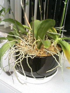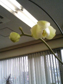 まだ寒い冬だというのに、職場にある胡蝶蘭に蕾が誕生しました。写真を見ての通り、いい加減小さくなっている鉢から根が飛び出しているし、苔も大半がゼッ不調なのに...この胡蝶蘭は、3年前に職場が移転した際、お客さんからいただいたものなのですが、これといった手入れをしていない...というより、出来ていない過酷な環境下にいます。不要な葉を除いたりする事はあるけれど、苔の様子(湿り具合)を見て判断しつつ基本的に水を与えているだけ!あと...私の熱い視線も毎日注いでいます環境を替えて全てがダメになってしまうのではないか?という不安があって、今まで踏み切れないでいたのです。が、流石に次の植え替えシーズンになったら、個人的に鉢やミズゴケを買って引越しさせてあげようかな...と計画しています。2006年の6月頃に咲き始め、全盛期を向かえ散り行くまでを携帯電話のカメラで撮り続けていた画像を”成長記録”として紹介します。今回はフォトアルバム(登録)しないでこちらにベタ貼りします 撮影:2006.5.8 17:30 蕾が膨らみ始めました撮影:2006.5.9 18:15 第一号咲きました撮影:2006.5.10 18:17 日当たりがイイ窓際にあるので、次々と咲きます撮影:2006.5.15 19:03 咲く順番待ちがズラリ撮影:2006.5.29 17:56 ほぼ満開!撮影:2006.6.9 18:41 枝の先にまで蕾が出来たのは初めてかも撮影:2006.6.9 18:42 分岐した先の先にまで蕾が!撮影:2006.6.9 18:42 職場にB’zポスターが!!撮影:2006.6.27 9:59 こんな不安定な枝でも無事に咲きました撮影:2006.7.6 12:19 咲いている方向はバラバラだけど...見事っ撮影:2006.8.4 12:16 あまりにも綺麗なのでアップを撮影:2006.8.4 12:15 でも...散り始めstartいつかは自宅で、シッカリと胡蝶蘭を育ててみたいな...洋ラン栽培コツとタブー洋ランを咲かせたい! Click先の企業が代わって募金をしてくれますご協力ください