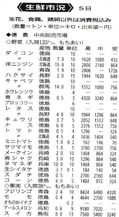 7月6日「青果市況」今年は梅雨明けが早く、暑い日が続いている。青果市況もナスやトマトが高温障害が発生しているようで、市況も少しずつ値上がりをしている。地元産のスダチも良い相場で出ており、これから8月のお盆まで露地物が出て来るまではこの相場が続くだろう。 にほんブログ村にほんブログ村読んだ方はクリックを