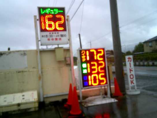 10月31日「本日のガソリン価格」今日は朝から終日雨、雨量も多く近所の畑では冠水してるところもある。本日のガソリン価格であるが、先月と変わらずの安定価格?ガソリンの旧暫定税率が12月31日に廃止が決まったようで、廃止までつなぎ措置が来月13日からあるとのこと。これでやっと少しは安くなりそうである。 手ぶれしてピンボケになった にほんブログ村にほんブログ村読んだ方はクリックを