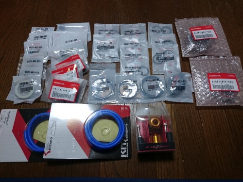 純正部品やその他がそろったので、リヤのベアリングから交換しようと思いましたが・・・センターボルトが46ミリと大きくて工具が無いベアリングは次回にしてリヤブレーキキャリパーのOH開始部品の一部キャリパーをばらして・・・プロアームとチェーンが少し綺麗になりました?パッドが微妙に変摩耗コンビブレーキの真ん中のピストンが固着気味。フルードは錆色リヤブレーキが弱いのはこれですね。原因が分かったのでOHで良くなるでしょうピンク石鹸とパーツクリーナーで綺麗にピストンの汚れと小さい錆はカッターの刃を使うと綺麗に取れます。綺麗になりました。新しいシールとブーツを新品に交換してシリコングリースを丁寧に塗って合体プロアームにキャリパーを取り付けるとエアー抜きがやりにくい・・・面倒なので外してエアー抜き長年交換していないフルードラインを洗うために、かなりフルードを使いましたよ。これでリヤブレーキはバッチリ?
