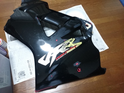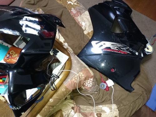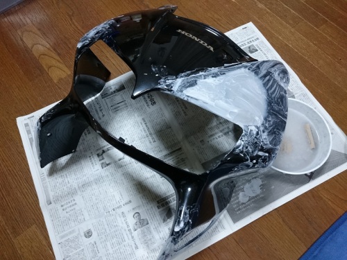 純正部品を注文している間にクリーニングと補修汚れてますよレンズの内側は丁寧に拭き掃除カウルの割れはアセトンで合体これは削って磨いてほげ~アセトンで合体させればいい徐々に仕上げていきます