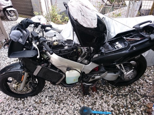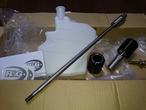 綺麗に仕上げて1ヶ月?Uターンでエンストしてこけたそうだその晩にスライダーを取付けると言い出したので注文したが、これってこける前に付けるものじゃないの?カウルを外して作業していたら小雨が・・・純正リザーブタンクを外して・・・付属のリザーバータンクを取付けるとスライダーを止めるスペースがエンジンマウントのシャフトを外してスライダーのシャフトを入れます。左右均等の位置にして。スライダーの土台を固定。土台の頭に塗料を塗ってカウルを仮固定ていてマーキング。小さな穴を空けて位置確認。土台の頭より気持ち大きい穴になるように穴をリューターで広げていきますスライダー本体取付けて完了カウルステーは叩いて補修クーラント漏れ発見!増し締めで様子を・・・続いて塗装し直したキャリヤーを取付け。ベースとポジションとブレーキの配線を付けて。通勤快速用のボックスを載せれば・・・GW用ツアラーの完成これで後は天気だけ?