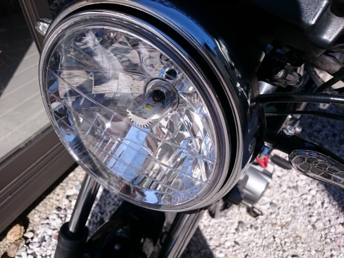 CB125TのヘッドライトをH4ハロゲンからLEDにバルブの後部にヒートシンクがあるタイプは取付できないが、このバルブは内側のLEDの下側半分がヒートシンクのタイプで取付可能ヒートシンクがリフレクターに映り込んで新鮮なイメージハロゲンよりも明るい6Wで2000円以下。リフレクターとの相性が問題になりますが今回は当たりでした