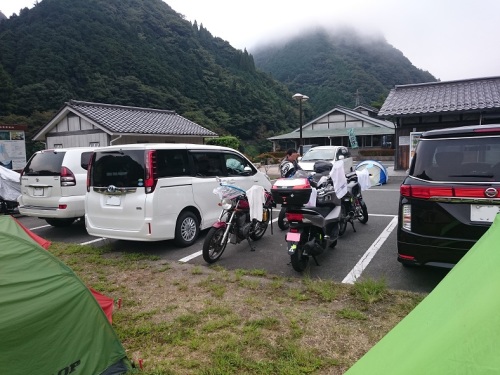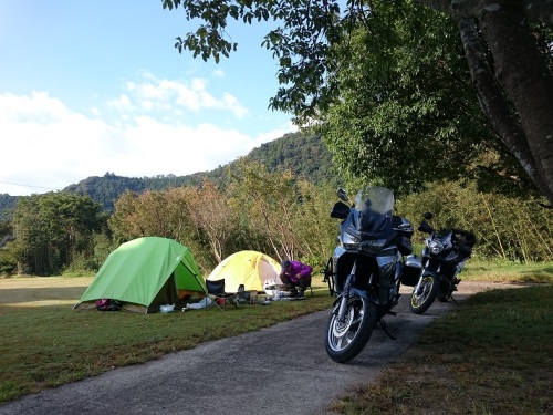 気候も良く気持ちの良い朝キャンプ場の海辺は綺麗なウッドデッキで朝日が綺麗楽しかったとびしま海道を走ってフェリーで今治へ。フェリーも気持ちよい今治から寒風山のUFOラインに向かう途中レッドバロンで休憩。中古車を見ていると友達が女の子に営業している何やら大型免許を取ってバイクが欲しいが何が良いのかわからないらしいがそんなことは自分で決めなさい!彼氏も欲しいらしいが、バイクに乗れば機会も増えるので大丈夫!でもね、結婚は人生の幸せとは限らないといらんことを言ってしまった馬鹿な営業ごっこも終わりUFOラインに到着。霧で真っ白・・・UFOラインは全線開通しています今夜の宿は千本高原キャンプ場。ここも無料です買い出しのお店まで3キロ。温泉までは7キロと便利な場所です。広いサイト綺麗な炊事棟綺麗なトイレ楽しいキャンプツーリングも終わり。荷物を片付けると雨が・・・自宅まで100キロなので帰りだけが雨なら問題なし。バイクはホント楽しいですね