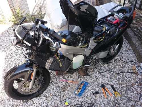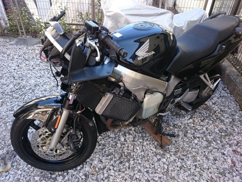 昨日からVFRの整備を開始しましたが、バイクを色々チェックしていると見ているだけで3時間気が付けば時間が無くなっていたので、整備は明日にしてとりあえず大きな傷から・・・立ちゴケで深く傷の入ったスクリーンカウルの塗装部分は息子の予算次第なので後日。ペーパーで研磨してコンパウンドで磨く。傷は無くなり、ピカピカでしょメーター照明もLEDに変更。色味が青白く変わっていい感じポジションランプをLEDに変更クラッチを握ってもニュートラルでしかセルが回らなかったので、クラッチSWをチェックすると接触不良をおこしていました。グリスを塗ってやると今度はリレーが固着気味・・・何度か操作するうちに固着は無くなり、無事何速でも始動OK夕方になったので明日に・・・今日は朝からジャッキポイントを探す。カウルとエキマニの間に少しだけオイルパンが見える。オイルパンとエキマニの間に合板を入れてジャッキの上にソケットレンチの27mmをのせてピンポイントでジャッキアップカウルを外してフロントフォークへやっとアクセス。フォークフルード出すと思ったよりも汚れていない?でも交換していないと思うのだが・・・内部に少し錆も出ているのでやはり変えていないでしょう。フォークを逆さにしておいて、フロントホイールのベアリングを交換する。こちらは見事にゴロゴロベアリング錆まで早めに交換していればね~っと思うのですが、ロックするまでは走れるから怖いベアリング交換も終わり、フォークに少し硬めのフルードを入れて液面130mmに調整してかなり絞めてあったプリロードをノーマル9ミリに調整して本日は終了。これからも傷や錆が出てきますよ