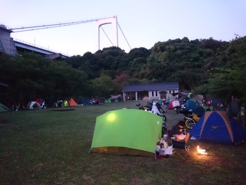 今回はしまなみ海道でVIP待遇をうけるために親子原チャリで角島ツーリングです。県境の道の駅木の香で休憩。しまなみ海道入口。VIP待遇の始まり通行料金が安い125CC以下しか利用できない無料キャンプ場。サイトは芝生で水洗トイレ。綺麗なのに無料SWなのでライダーが結構います。荷物を降ろしてテントを設営したらふら~と出発。伯方の塩ラーメンで有名な三和到着。う~んスープはうまい続いて伯方の塩の工場見学3年前はこれが近くで見れなかったので満足最後は温泉ですね。やはりツーリングは温泉