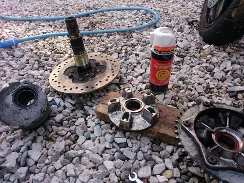 今日は助っ人の力を借りて作業開始。まずはスプレーして放置油圧クラッチのフルード交換。続いて本題今回はステンレスの9ミリ材を当てに使って軽めに叩いて振動をあたえながらスプレーを繰り返すこと3時間・・・動いてきた~!インパクトレンチ風の作戦で取り出し成功ガッチガッチに錆びたシャフト・・・スイングアーム側はあまり汚れていない。ダンパーが足りないのは落としただけ。繋ぎが切れていますが再使用可能。中央のギザギザ部分が錆びて固着の原因。汚れています。錆びてます。ボールベアリング、カラー、ギザギザ部、カラー、ボールベアリング、ボールベアリング、計6か所が錆びて固着してるから簡単には外れない。ニードルベアリング部分は綺麗でよかったですダストシールを外してベアリングも外します。ベアリングは合計4個使っているからなのか?フロント程の痛みはなかったです。すべて綺麗に洗ってから新品のベアリングとダストシールを組んで組み付けですグリスをたっぷり塗って合体一時はどうなるかと思っていましたが、無事にベアリング交換が出来て良かったです。後はリンク部分のグリスアップをすれば足周りは終了かな?助っ人さんに感謝!