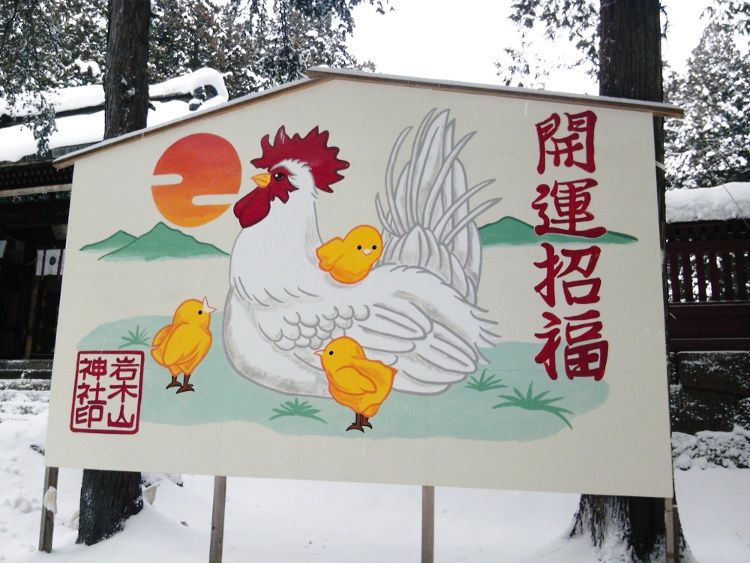 明けましておめでとうございます!今年もどうぞ宜しくお願いします。今年も初詣は岩木山神社です。混雑する三が日を避けて5日となりました。「開運招福」今年・酉年の巨大絵馬です。堂々としたニワトリと、可愛い3匹のヒヨコたち。拝殿正面に下げられた注連縄(しめなわ)は、「端の飾り結びが特徴的」ということなので撮影してみました。井形になってます。