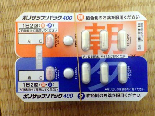 胃カメラをのんで2週間。精密検査に出された胃の細胞は、3つとも正常な細胞でした!!!あー、良かった!そして医師から処方されたのが「ボノサップパック400」ヘリコバクター・ピロリ感染症に対する除菌療法に使用する薬剤です。「タケキャブ20×1錠、クラリス200×1錠、アモリン250×3カプセル」が1セットで、朝用と夕方用に色別され、ミシン目でつながった1シートになっています。1週間分の処方なので、全部で7シート。抗生物質なので腸内細菌が死んでしまうとか!?大事に育ててきたのに残念。。お腹がゆるくなることもあるので、ヨーグルトなどを食べるようにとのこと。また、1日目2日目の副作用が心配なので、病院が開いている平日に開始するようにとの指示でした。これらを服用している間は、胃薬は中止。「強力かつ持続的な酸分泌抑制作用を示すタケキャブ錠を含めた3剤を1日服用量として1シートにまとめて包装した製品です。抗生物質がピロリ菌に効果を示すためには、胃の酸性度pHを弱めなければなりません。 そのためには胃酸の分泌を抑えるプロトンポンプインヒビター(PPI)という薬が使用されます。 ボノサップとランサップはPPIと抗生物質1日分を1シートにまとめた薬です。 そのちがいは、PPIのちがいです。 ボノサップ・・・タケキャブ(ボノプラザン) ランサップ・・・タケプロン(ランソプラゾール)ボノプラザンの酸分泌抑制効果はランソプラゾールより強力で、除菌効果も大きく凌駕する結果が出ています。また、抗生物質であるクラリスロマイシン(クラリス錠)が効きにくくなっている耐性ピロリ菌に対する除菌率ではボノサップはランサップより高い除菌率を維持しました。(「ボノサップパック400と800のちがいとランサップ | YG研究会 賢く生きる」より)」