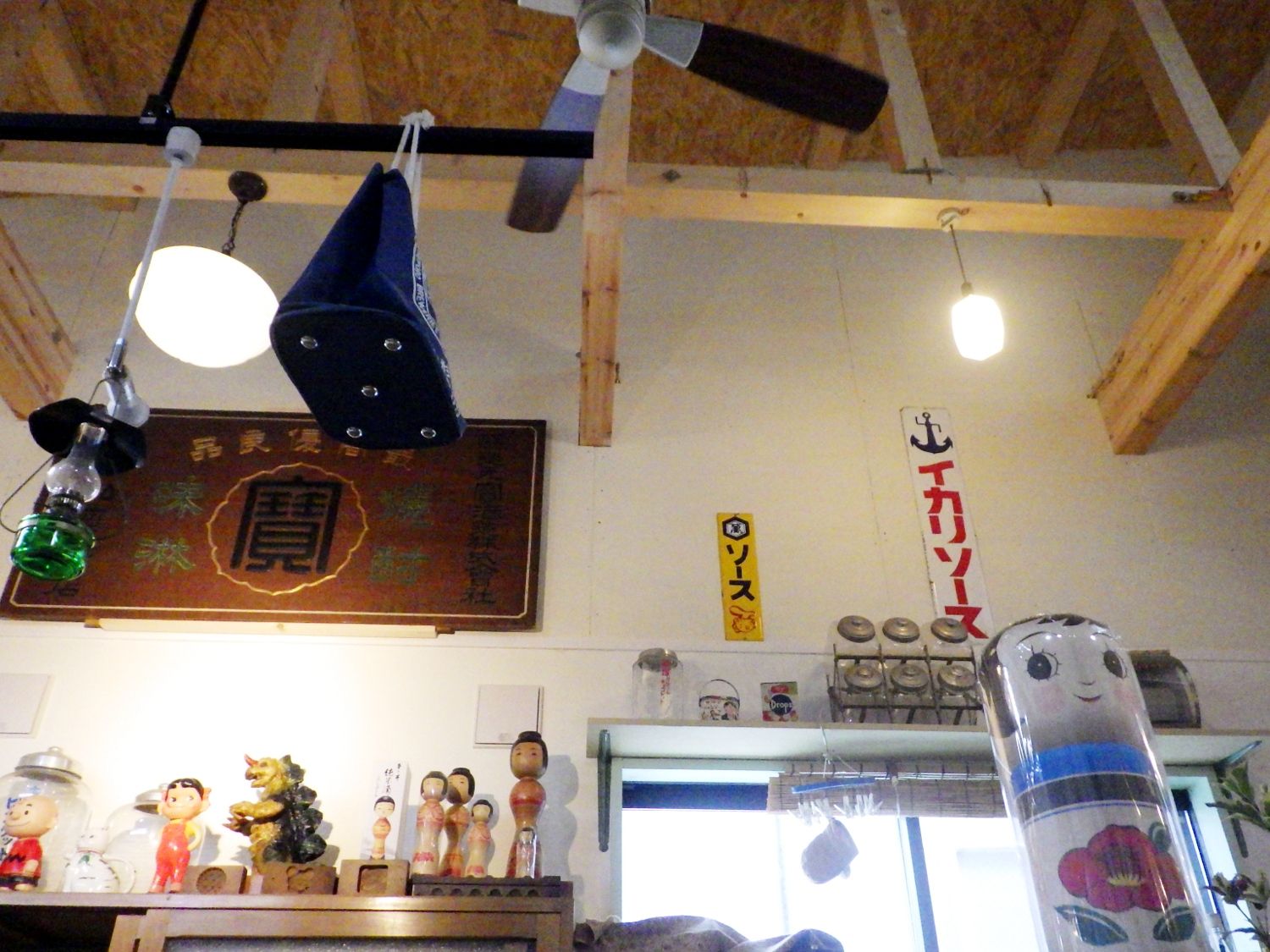 天井高い! 白木の梁を使った店内。宝酒造やキッコーマンソースやイカリソースの看板があったり、
