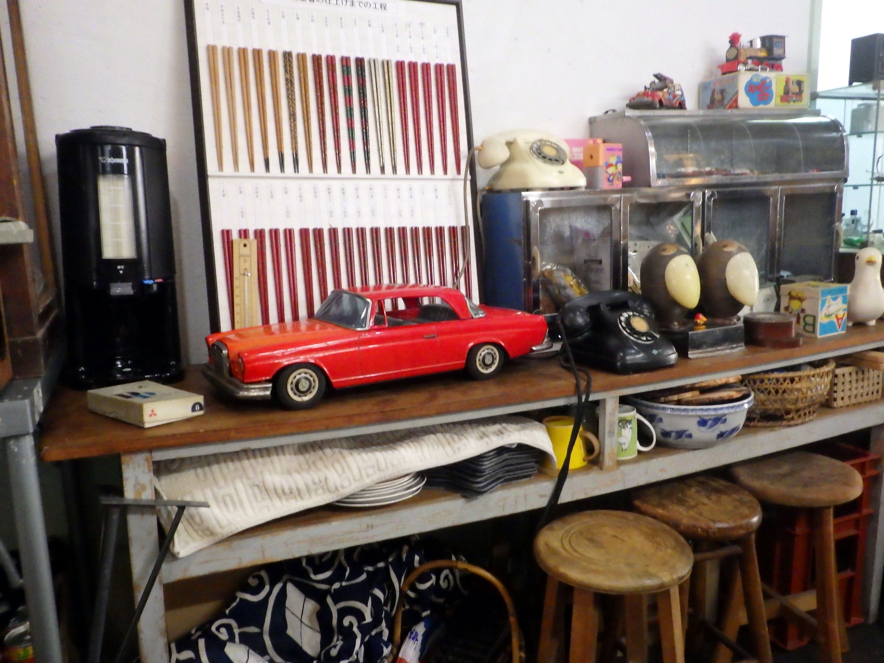 カウンターの後ろには真っ赤なクルマに、黒電話、キョロちゃんがいると思えば