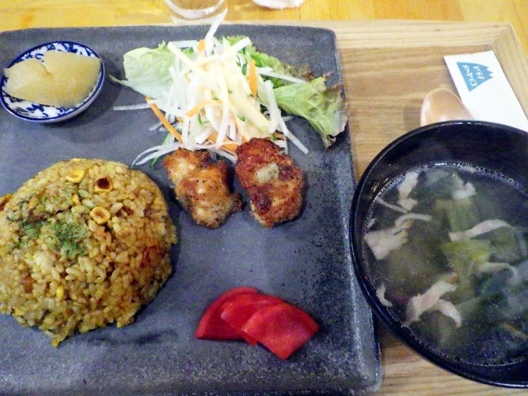 そしてこちらが本日の日替りランチ550円「カレーチャーハン、チキンカツレツ、大根サラダ、コンソメスープ(ベーコン、キャベツ、玉ねぎ)。煮たりんごと、赤かぶ漬けもついてました。チャーハンはコーンやウィンナーが入って、パセリがぱらり。
