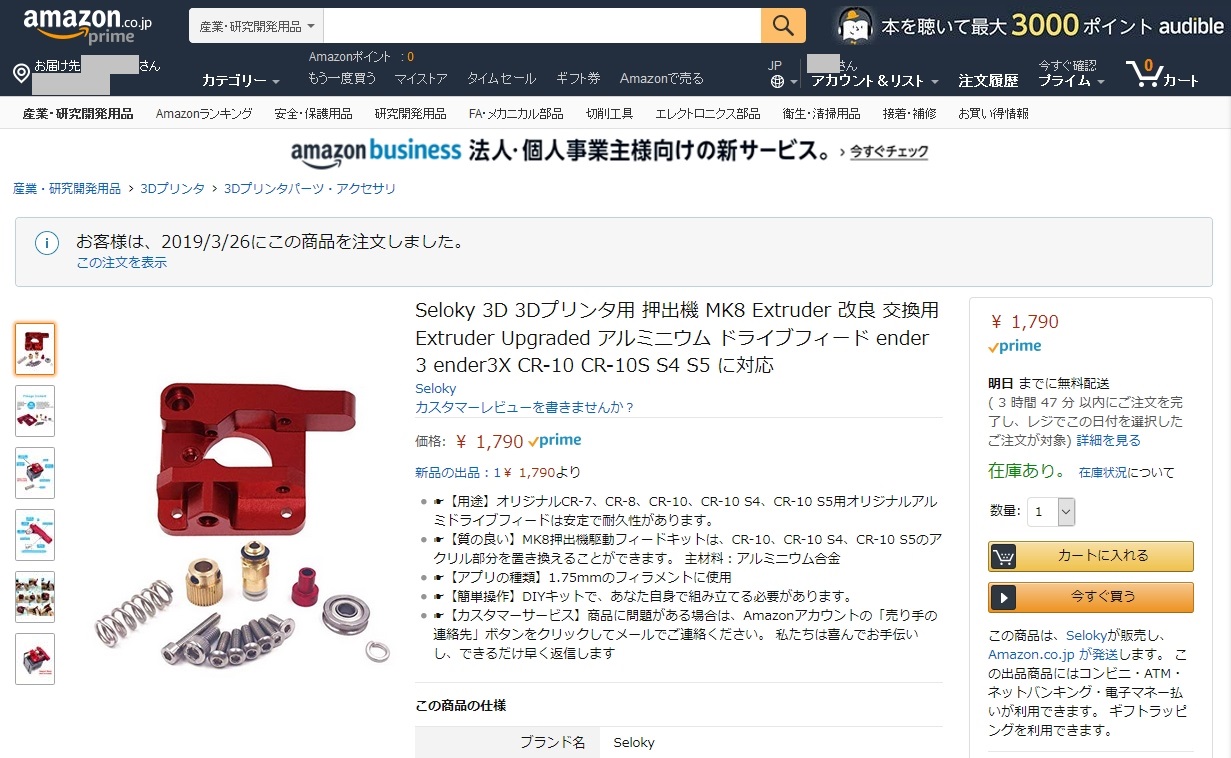 例によって3Dプリンターネタです(^^ゞ…飽きないね~(笑)でも最近は人様の作ったデータをそのままプリントするよりも基板を収める箱などを作って喜んでます…一応ミリ単位程度の精度では出力できるので基板をきっちり収められるケースを作れるのは嬉しいです閑話休題購入したのは…Seloky 3Dプリンタ用 Extruder Upgraded ender 3 ender3X CR-10 CR-10S S4 S5 に対応Amazonが発送するプライム対応品で¥ 1,790でした到着時間を気にしなければ1000円以下もたくさんありましたけど…今日の今日欲しいしね~例によって大雑把に到着しました実際には白箱ですがちゃんと箱入りでしたよ放り込んである感はいっぱいですが…例によって言葉の綾ということで(^^ゞ中身はこんな感じ六角レンチまでついているのはとても親切ですが、一番太いネジ1本だけはこの付属しているレンチでは太さが足りず回せません…Ender-3に付属してるサイズですが取説も丁寧なようで大雑把?まあ、収まるところに収めていくだけなのでパズルのような難しさはないですで、こちらがオリジナルの樹脂製Extruder樹脂製ですが、結句しっかりしていて私の馬鹿力でも折ってしまうような頼りなさは感じません組み替えるとこうなります赤いペイントが目に付くので、ちょっと格好良くなった気はしますね謳い文句だと強度が上がるのでより正確にフィラメントを送れる…らしいですが実際はどうだろうね~見た目重視というのが本音のような気がしますでもまあ、ラジコンヘリのメタル化と違って重たくなるのでうまくないと言うことはなさそうですそれからもう一つ補修用部品を買ってますラベルを読めばわかりますが※かすれてて読みにくいですがComgrow 純正 Ender…アルミヒーターブロック スロートパイプと印刷されてますEnder-3 ホットエンド一式こちらはポイント還元差し引きで1000円を切っていたので、ついでに注文しましただってノズルやテフロンのパイプだけを買っても1000円くらいはしちゃいますからねただ、商品ページの写真と違って断熱材がこちらはシリコンのゴム製でした取り回しにはゴムカバーをはめ込むだけなので、断熱材をカプトンテープで貼るよりも簡単だと思いますマザーも予備を買っているので、そのうちもう一台…なんてことになってしまうのかな~置く場所もないのでそれはやめておくつもりですが…ということで、相変わらず3Dプリンターをいじっていたと言うお話でした