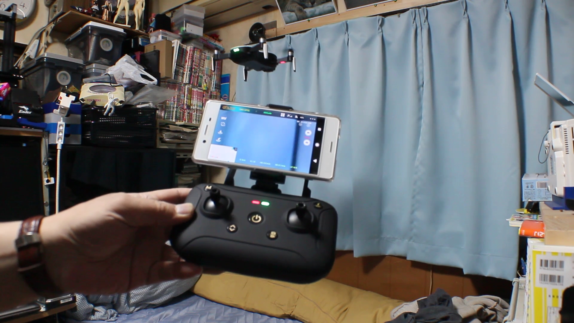 到着した日にGPSが使えない室内でちょっと飛ばしたときには全く位置決めしてくれなくて、難儀したので取説を読んでみたら…GPSモードではそっちは使わないみたいで、コントローラーでモードを変更しなきゃなんならしい左上にあるMキーを長押ししてモード変更写真のようにコントローラーの2個あるLEDの左側が赤いときは光学・超音波モード(GPSモードでは緑)取説にも、「初心者はこのモードは使わないほうが良いよ」みたいな感じで書かれていました…取説は読もうね~(笑)H501SでもGPSモードのオンオフがあったけど、おんなじ感じただ、H501Sと違い、GPSがなくてもある程度はカメラと超音波で位置決めをしますよ…と言う感じ。なので、行くも戻るも全部自分でやらなければならないので、確かに初心者には辛いですね。慣れていれば、ビュンビュン飛ばすにはよいですがBebop2ほどのスピードは出ないんですよね~というわけで、色々御託を並べましたがモードを切り替えて飛ばしてみました今日も5分程度で絞りましたが音入りです例によって私の狭い部屋なので機体自身が起こす風で結構フラフラしてますが、GPSを掴んでいないGPSモードよりも断然飛ばしやすかったですもう少し広ければ確実に安定するだろうという感じでした関係ない話だけど、この動画は5月に買ったEOS Kiss X5で撮影しましたX3からFullHD動画撮影機能が搭載されたけど、動画をちゃんと撮影したのは初めて…三脚を立てて撮影し、画角に収めるために途中でカメラを動かしたりしてます(^^)…操作がわからず、取説を引っ張り出してしまったのは内相の話(^^ゞだんだん操作がわかってきたような気がしてます。ただ、ちょっと問題点…機体やコントローラーの話ではないですが、iPhone6をモニターに使うほうがなんとなくですが、使いやすいような気がするのですが、バッテリーがすぐになくなってしまいます。下手するとバッテリー1本文持たない(* *)AndroidではそんなことはないのでうちのiPhone6のバッテリーが駄目なのかな?単なる待受なら結構普通に持つんだけどな~