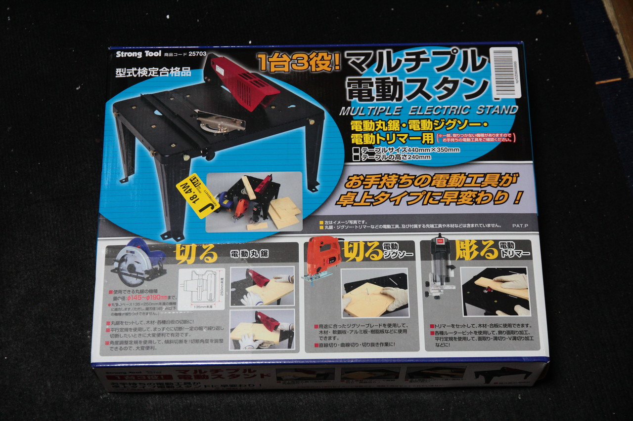 先日ネジが折れたジグソーが直り、代わりに丸ノコを買ったことにちょっと触れましたが思い切って電動スタンド(作業テーブル?)を購入しましたプラ系の簡単なカットならリューターに丸ノコ取り付けてなんとかできるんですが金属とか木材から必要なサイズを切り出すなんて言うときにはリューターでは力不足なのでピラニア鋸などで手切りしていましたなので、テーブルソーはほしいな~と思っていました※AliExpressで頼んだら詐欺だったというのは内緒←ネタにしてるじゃん(笑)購入したのはこんな物です…イチネンアクセス ツール事業部 ストロングツール マルチプル電動スタンド 25703 1台3役丸ノコ・ジグソー・トリマーを取り付けて卓上ツールとして使えるテーブル…と言う事です※やっていませんが3つを同時に取り付けて…というのはやめたほうが良いでしょう組み立てるとこんな感じになります(ってもうジグソーを取付済みですが)流れ的には丸ノコを取り付けるべきですが…ジグソーを取り付けました私がよくやる作業といえば細かい木材やアルミなどをカットすることなので対応しやすいジグソーにしましたジグソーのスペースはテーブルの端っこ、反対側の丸穴にトリマー中央が丸ノコと言う配置になります少し工夫すれば丸ノコの位置にジグソーを固定することも出来そうな気がしますけどねとりあえず試し切り…ジグソーに金属用の刃がついていたのでアルミ板から…2mm厚のアルミ板ですがとても簡単に切れましたまっすぐ切れてますね~今までだとハンドニブラーで切っていましたが2mmはカットできる厚みの最大値をちょっと超えているので、とても大変でしたが簡単に切れましたで、刃を木材用の回し引きに付け替えて…深い意味はないけど手書きした「N」を切り出してみました細かいカーブをなると糸鋸じゃなければ無理ですが、なんとか切り出せましたウネウネと曲がっているじゃないかって?いえいえ、私がフリーハンドで書いた物をなぞったのでこれで正解です(^^ゞで、直線引きに付け替えて…2×4材をカットしてみました(うちのジグソーでは厚みが限界なので時間はかかりました)それよりも、カットした面を下にして置くと…立つ!コムスのコンソールBOXの最初で…断面がガタガタでしたが、これからはいくらかマシになるでしょうまあこういうカットは丸ノコに登場いただけば一発なのでジグソーで切ることもないですけどね一番仕事をしてもらえそうなのはアルミを切り出して好きなサイズのステーを作る…なんて言うときでしょうけね、でもとりあえずは動作確認が終わったので保管ですね(笑)そんな加工は年中やるわけじゃないけど、金属の加工ができるのは嬉しいですおもちゃみたいなやつだけどボール盤もあるし溶接の機材もあるのでやる気さえ出せば結構いろいろ出来そうですねということで作業台を買ってジグソーでテーブルソーもどきを仕立ててみたというお話でした