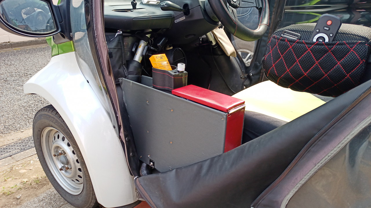 コムスにカップホルダーのあるコンソールボックスみたいなものを…と言うネタを先日アップしましたが…どうせなら小物入れもほしいし、前輪のタイヤハウスまで伸ばしてしまえ~と作り直しました完成形です…箱を置いてしまったので左側から乗り込むのは大変です材料は…先日の残りの2×4材に加えて1×4材と4mmのベニヤ板2枚(3枚写ってますが)それを仮組みして…タイヤハウスのカーブに合うようにカットこの時点では側面のベニヤをねじ止めしただけですが、こんな感じになれば…と言う感じ形ができたので一度バラしてそれぞれの部品に100均で買ってきた合皮を貼って…再度組み上げてコムスに取り付けて冒頭の状態になったわけです固定方法ですが、先日は後ろ部分を固定しただけでしたが今回は長いし大きいので床の固定ネジにステーを共締めして前後2箇所で固定されてます…なのでグラつきません(^^)タイヤハウスの部分も軽く止めておこうかと小さいステーを買ってきましたがそっちはまだ未施工です別角度の写真を何枚か…運転席目線だとこんな感じかなり大雑把ですがタイヤハウスのカーブに沿っているでしょう?段ボールを当てて型取りしてなんとか形になりました手前の赤い蓋は蝶番で開閉できて小物入れになってます前方はフタ無しでウエスを放り込んでおくか、適当な袋を仕込んでゴミ箱でも良いかな~ドリンクホルダー部分は先日のシートの隙間埋めの後ろ部分を切り取ってカップホルダーとUSB電源を移設コムスでUSB充電はやらないような気がしますが、せっかく買ったのだから取り付けたいな~とホルダー部分もそれなりに仕上がったと思ってます…多分言わなければ「こういう物」があると思ってもらえるんじゃないかな?ということで、コンソールBOXと言っても恥ずかしくないような物を改めて作ったと言うお話でした