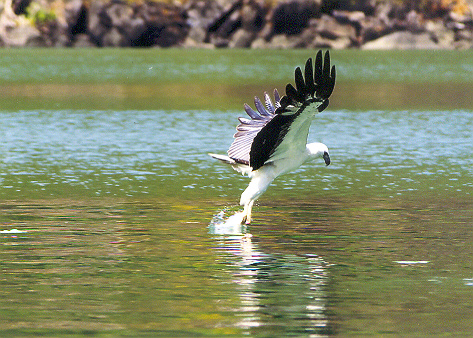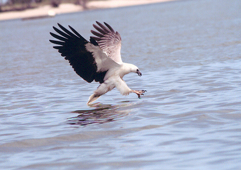 このシロハラウミワシは真下で跳ねる海老を捕食しようと狙っていますが、この幼鳥にとって海老の捕食は魚より難しい事を未だ体験していない!