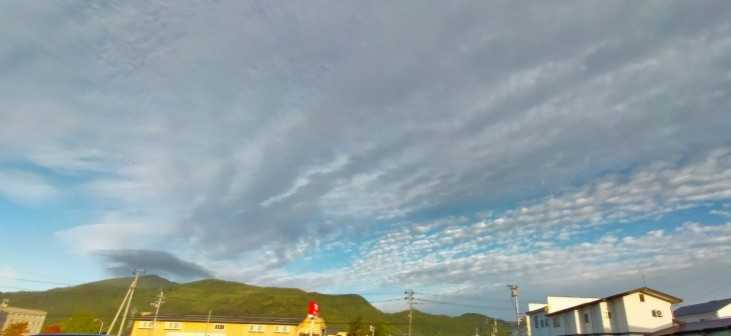 昨日は1日雨降り今日は朝方まではポツポツと降ったり止んだり日中以降はそんなに寒くもなく過ごしやすい天気でした今週は台風の進路と秋雨前線の動き次第で天気が変わりそう夕方に買い物に行った時に撮った1枚だいたい午後4時頃秋空にひつじ雲と層積雲の組み合わせ雨上がり後の秋らしい空