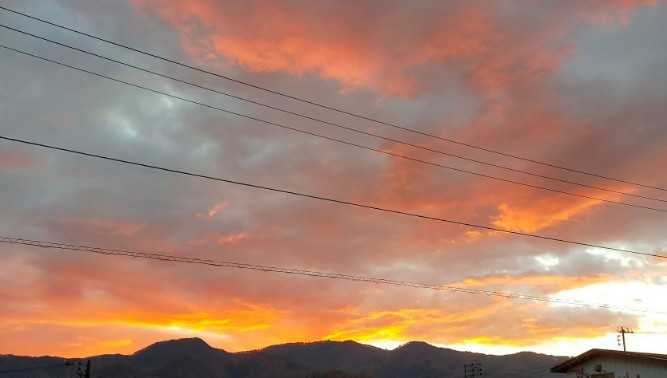 日が暮れるのも早くなってきた今日の日の入りは16時26分16時20分頃に山並みを見たら紅葉している山と夕やけで山がきれいな赤色に!!明日の午後からは次第に天候が悪くなりそうですそして火曜日には雪が降るとか