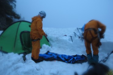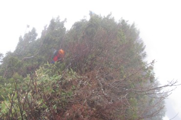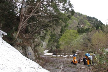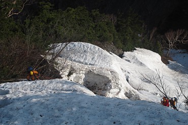今日は定時上がりを目指したやまやろうです。真面目にやっていても会社に認められないことばかりでウンザリ(テクニック必要)。図書館寄って楽しそうな本を借り、現実逃避しよう。現実から逃避できるものとして登山があるが、その中でも登攀は究極である。そこにあるのは岩あるいは雪。そして自分の身体のみ。時間の流れを忘れ、それらと対峙する。準備段階では、落ちたらただでは済まないと思いながら、壁を眺める。しかし登攀を始めたら落ちることは考えない。目の前ひとつひとつのステップやホールドに全神経を集中するだけだ。それが最高の瞬間だ。生きている、今、自分は、生きている。それだけしか頭にない。この感覚を知ってしまったら、山を辞められませんよ。GW山行で唯一ロープを出したのが、滝倉山とウドの頭の間のコルからの登りである。トップはリーダーのやまやろう。最初の雪壁3mが難所である。ここは雪渓最上部でシュルンドにより山の斜面から離れている。眼下もパックリ雪が割れており、落ちたらかなりの距離を滑落することになる。3mさえ越えられれば後は楽だったのでここを突いたのだ。トラバース気味に垂壁にステップを切るのは少し難しかった。前述のように「生」を思い切り感受しながら登った。やまやろうにとっての4日間の山行のハイライトだった。神々しい景色よりも自らのアクションをからめた景色の方が、記憶に残ると思う。