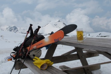 G会館に前泊して、Yたさんと立山だ。当初毛勝山を計画していたが、大明神沢からの岩雪崩の情報があったのでスキーには不適とパス。大日岳も候補に挙がったが、アプローチの長さと下りのだらだらからスキーはつまらないとパス。登らずに雪山に行けるアルペンルートに流れてしまった。詳細は後日報告しよう。今日は疲れて眠いのだ。浄土山東斜面と雄山の山崎カールを滑った。登ったのは計2時間と短かったものの、午後の滑りは雪質の悪化で辛い滑りとなったので、体力は低下した。室堂山荘までの登り返しでは、黄色い液体のことだけを考えていた。そしてこれ。奥大日岳やスキーヤーを眺めながらのビールは、汗をかいた身体には最高ですな!