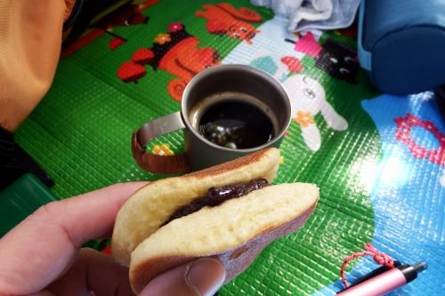 どら焼きは抜群の相性だ。山頂でコーヒー豆を