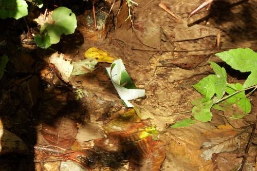 13:34 沢の流れに笹舟を浮かべてみる。山頂で