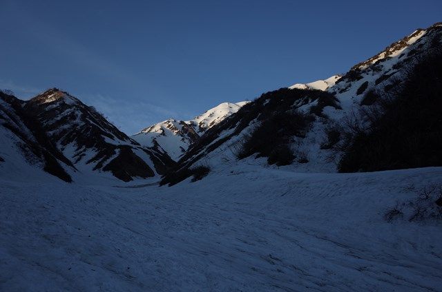 5:25 小清水出合い。稜線に朝日が当たり輝く。
