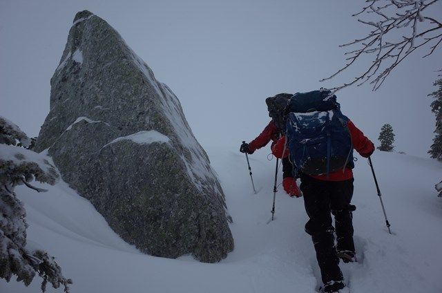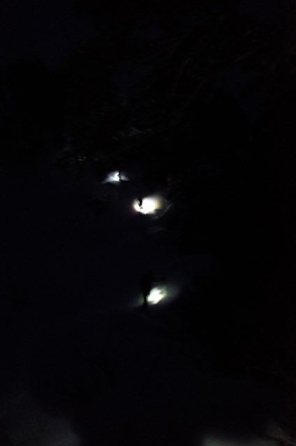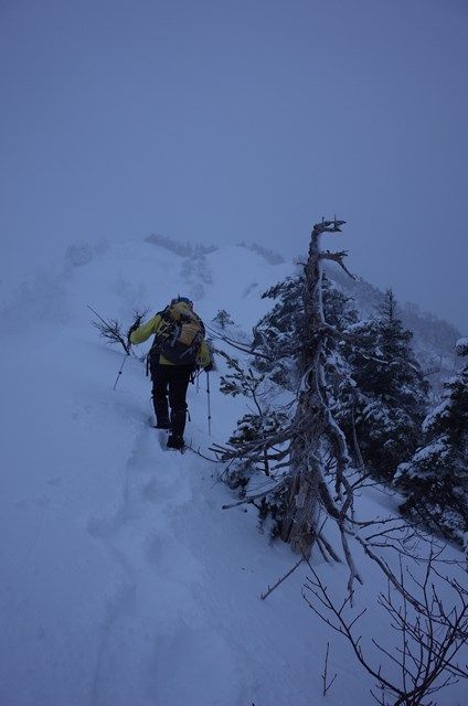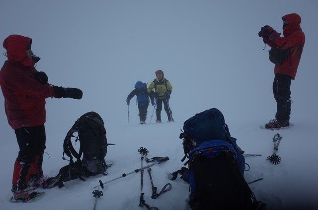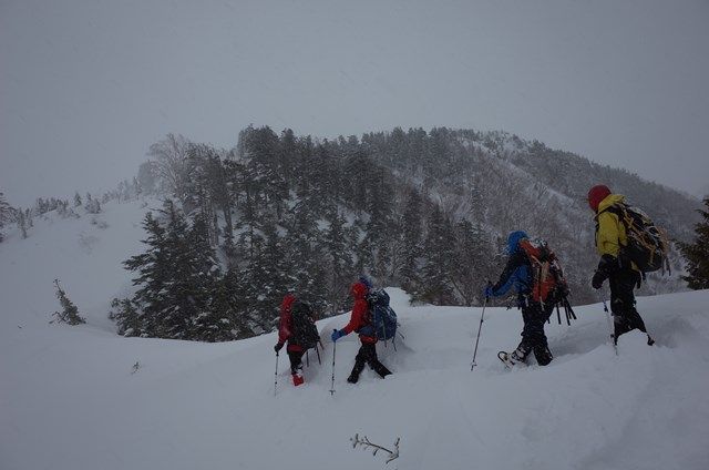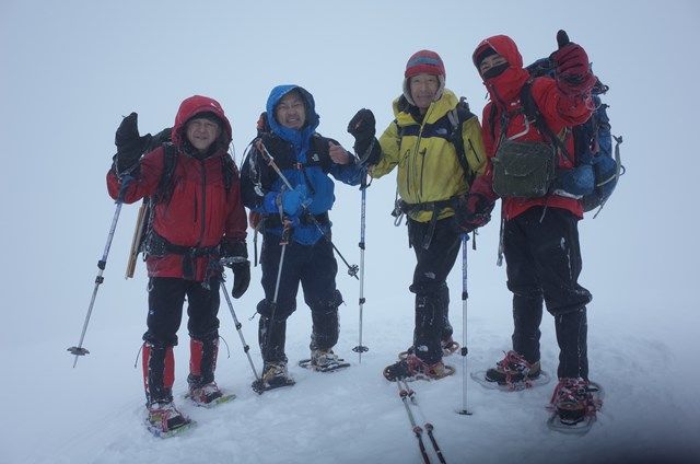6:05 1530m ワカンを履いて出発。小雪。登攀具、