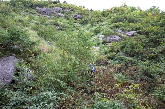 草付き帯となる。潅木を頼りに下れそうな