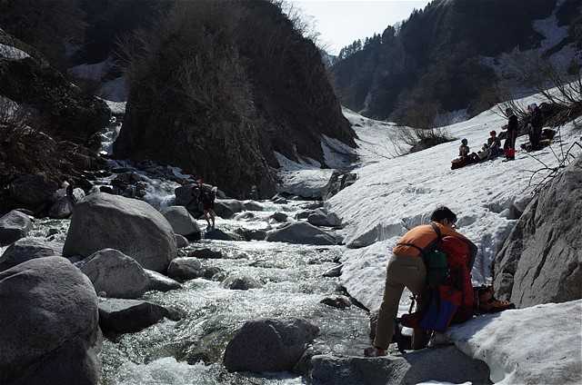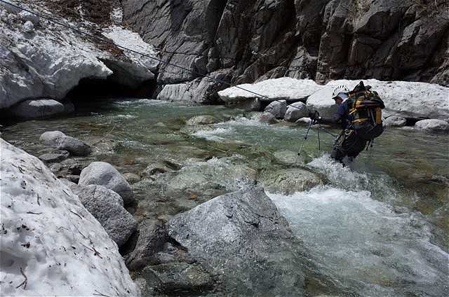 左岸から右岸へ徒渉している。