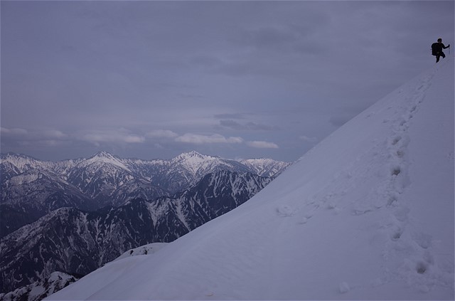 15:18 稜線上で幕営地を探す。東側が雪庇状になっているので近づくも、風が吹いている。