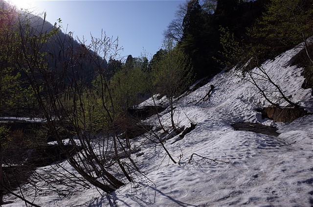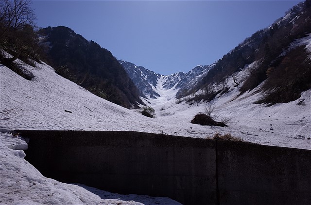 9:03 最終堰堤は右岸の雪がつながっていた。