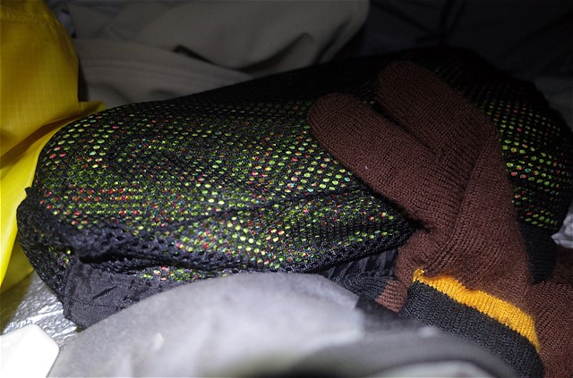 20:20 寝る支度を整えた。ロープは枕。軽量化のため寝袋なし。シュラフカバーのみ。フリース上下、ダウン上下、フリースネックウォーマー、ウールキャップを着込む。